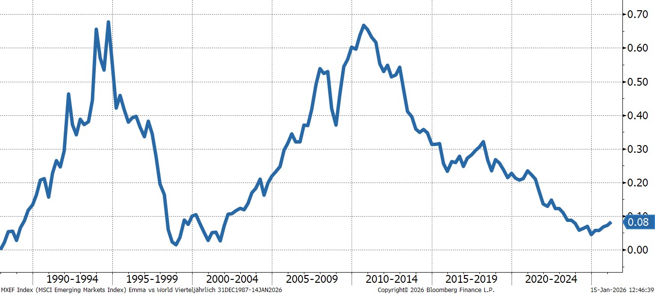 MSCI Emerging Markets versus MSCI World (31.12.1987 bis 14.01.2026)