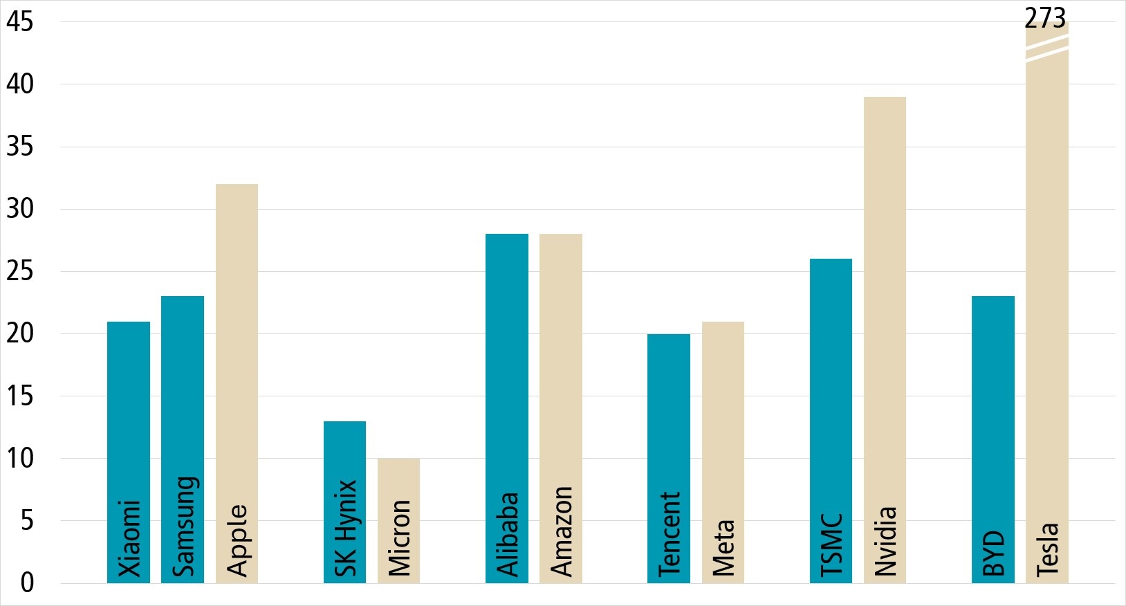Ein konkretes Beispiel: Der Technologiesektor der Schwellenländer umfasst weltweit führende Unternehmen in den Bereichen Halbleiter, Elektronik, Hardware, Software, Outsourcing und Cloud-Technologie. Während das Thema Softwaredienste allgemein bekannt ist, ist es entscheidend zu erkennen, dass Technologieunternehmen aus Schwellenländern ebenfalls aktiv an der KI-Revolution mitwirken, die mittlerweile in vollem Gange ist. Der strukturelle Aufschwung bei KI-bezogenen Produkten verleiht asiatischen Technologieherstellern einen erheblichen Auftrieb. Taiwan beispielsweise produziert rund 90 % der weltweit hoch-entwickelten Halbleiter, während Südkorea für etwa 50 % der globalen Versorgung mit Festkörperspeichern verantwortlich ist. Im Jahr 1990 dominierten die USA und Europa die Halbleiterproduktion mit einem Anteil von über 80 %, heute entfallen auf diese beiden Regionen jedoch nur noch 23 % der weltweiten Halbleiterproduktion. Der verbleibende Anteil geht an Asien. Zudem sind bis zu 75 % der Zulieferer der «Glorreichen Sieben» ausserhalb der USA ansässig, insbesondere in Ostasien und Südostasien. Anleger in Schwellenländern können von diesem wachsenden Trend profitieren, indem sie in Unternehmen investieren, die ähnliche Dominanz, vielversprechende Wachstumsaussichten und hohe Qualität wie US-Technologieunternehmen bieten, jedoch zu einem Bruchteil des Preises.